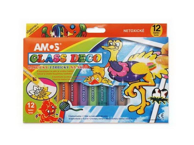 Balení obsahuje 12 barev 10,5 ml s šablomi, fóliemi a lepidlo.